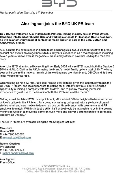 11 December 2025 Not for publication: BYD UK has welcomed Alex Ingram to its PR team, joining in a new role as Press Officer. Reporting into Head of PR, Mike Gale and working alongside PR Manager, Rachel Goodwin, he will be another key point of contact for media enquiries across the BYD, DENZA and YANGWANG brands.
