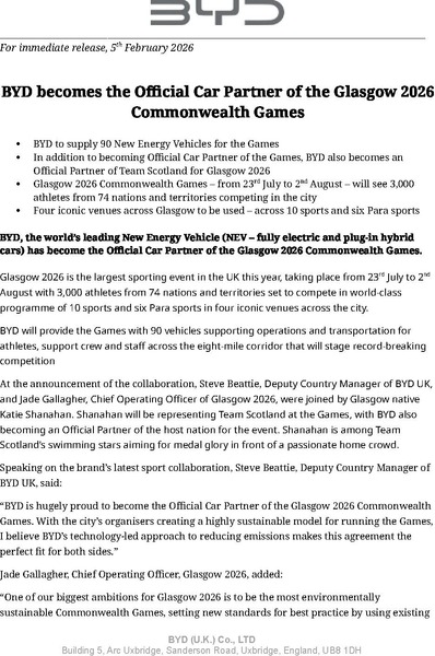 - In addition to becoming Official Car Partner of the Games, BYD also becomes an Official Partner of Team Scotland for Glasgow 2026