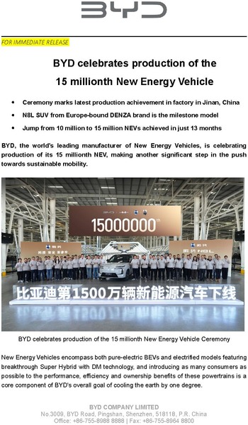 18 December 2025 BYD, the world's leading manufacturer of New Energy Vehicles, is celebrating production of its 15 millionth NEV, making another significant step in the push towards sustainable mobility.