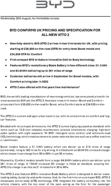 20 August 2025 - BYD, the world’s leading manufacturer of new-energy vehicles, has announced prices for its most accessible SUV yet: the ATTO 2. Available in two trim levels – Boost and Comfort – prices start from £30,850 on-the-road for Boost, while Comfort starts at £34,950 on-the-road.