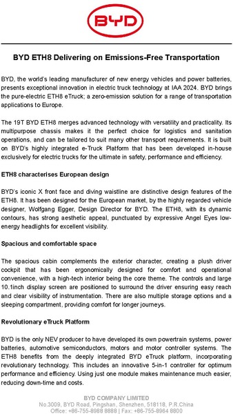 16 September 2024 BYD, the world’s leading manufacturer of new energy vehicles and power batteries, presents exceptional innovation in electric truck technology at IAA 2024. BYD brings the pure-electric ETH8 eTruck; a zero-emission solution for a range of transportation applications to Europe.