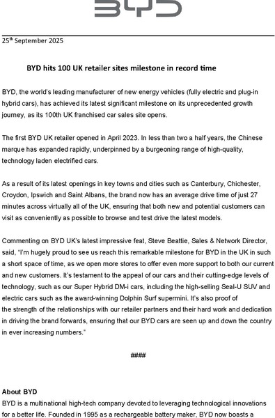 25 September 2025 - BYD, the world’s leading manufacturer of new energy vehicles (fully electric and plug-in hybrid cars), has achieved its latest significant milestone on its unprecedented growth journey, as its 100th UK franchised car sales site opens.