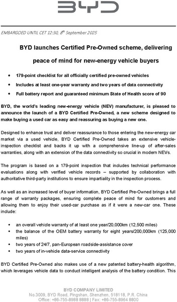 08 September 2025 - BYD, the world’s leading new-energy vehicle (NEV) manufacturer, is pleased to announce the launch of a BYD Certified Pre-Owned, a new scheme designed to make buying a used car as easy and reassuring as buying a new one.