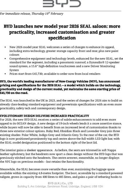 19 February 2026 BYD, the world’s leading manufacturer of New-Energy Vehicles (NEV), has announced pricing and specifications for the 2026 SEAL – a model which builds on the technology, practicality and design of the current model, yet maintains the same starting price of £45,730 on-the-road.
