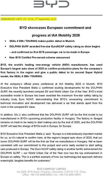 BYD Executive Vice President Stella Li said: “Europe is a tremendously important market for us, so it’s natural to confirm here, at the region’s largest auto show of 2025, that our iconic DOLPHIN SURF will be the first car that we manufacture in Hungary. We’ve been consistent with our commitment to this project and we’re really excited to start selling cars produced in Europe. The Euro NCAP safety rating is another terrific achievement for DOLPHIN SURF – our World Urban Car of the Year now has the top endorsement in Europe on safety. This is a perfect example of how our technology-led approach delivers meaningful, tangible benefits for customers.