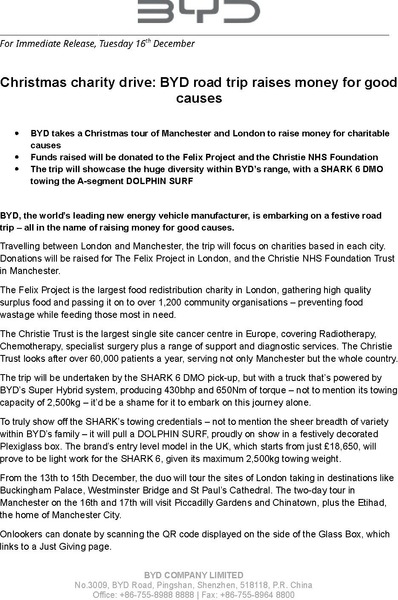 - BYD takes a Christmas tour of Manchester and London to raise money for charitable causes