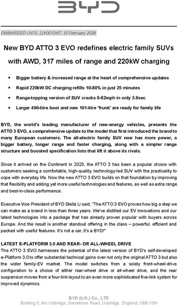 First deliveries of the ATTO 3 EVO are expected in the spring. It comes with BYD's comprehensive after-sales support, including a six-year manufacturer's warranty for the vehicle and eight years or 155,350 miles of cover for the battery with a guaranteed State of Health (SOH) of at least 70%.