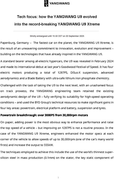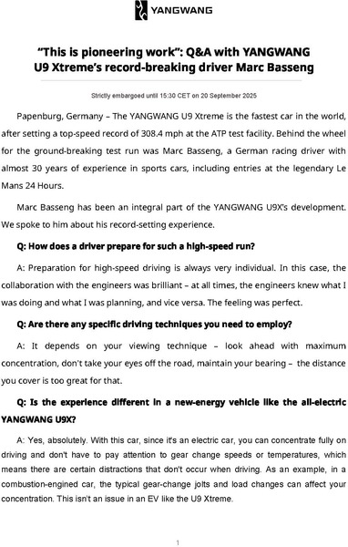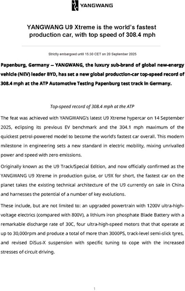 20 September 2025 Papenburg, Germany -- YANGWANG, the luxury sub-brand of global new-energy vehicle (NEV) leader BYD, has set a new global production-car top-speed record of 308.4 mph at the ATP Automotive Testing Papenburg test track in Germany.