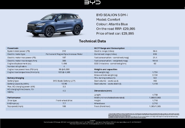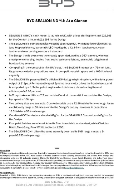 - SEALION 5 is BYD’s ninth model to launch in UK, with prices starting from just £29,995 for the Comfort trim, and £32,995 for the Design