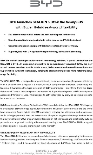BYD Executive Vice President Stella Li said: "We're confident that the SEALION 5 DM-i is going to be another BYD with huge appeal for consumers. Millions of customers around the world have welcomed Super Hybrid with DM technology, enjoying the refinement and response of an EV driving experience with the reassurance of a petrol engine as back-up. And we know that buyers of family SUVs are particularly focused on not only space and practicality but also pure-electric range and, crucially, efficiency and running costs. The SEALION 5 DM-i brings all of these qualities, instantly standing out in the market.”
