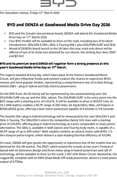 - BYD and the Group’s new premium brand, DENZA, will attend the Goodwood Media Drive Day on 17th March 2026