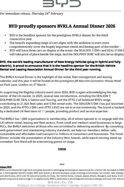 26 February 2026 BYD, the world’s leading manufacturer of New Energy Vehicles (plug-in hybrid and fully electric), is proud to announce that it is the headline sponsor for the British Vehicle Rental and Leasing Association Annual Dinner for the third year running.