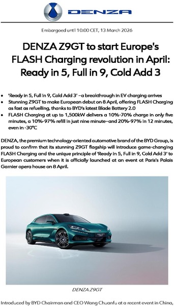 13 March 2026 DENZA, the premium technology-oriented automotive brand of the BYD Group, is proud to confirm that its stunning Z9GT flagship will introduce game-changing FLASH Charging and the unique principle of 'Ready in 5, Full in 9, Cold Add 3' to European customers when it is officially launched at an event at Paris's Palais Garnier opera house on 8 April.